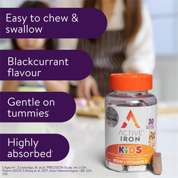 Active Iron Kids contains iron which supports energy and iron levels, helping to fight tiredness and fatigue. Active Iron is specially formulated to help avoid constipation, making it kind on the stomach, whilst helping to support iron levels.