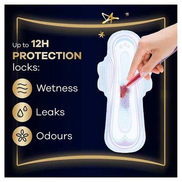 Don’t settle for less than an uninterrupted night's sleep with up to 12h protection : ALWAYS Ultra Secure Night Extra (Size 5) sanitary towels with wings and absorbent & gentle feel toplayer are designed with 3 protection features so that you don’t wake up to check for leaks or change your pad halfway through the night. A 9% larger front and 85% larger back (vs. Always Ultra Normal size 1), paired with our LeakGuard technology ensure all-around coverage to prevent leaks during period nights. Always Ultra pads are dermatologically approved by the Skin Health Alliance.