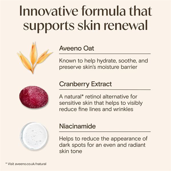 Dermatologist developed and clinically proven to visibly reduce wrinkles and dark spots and improve firmness while being gentle on sensitive skin. AVEENO® Age Renewal expertly combines Oat, Niacinamide, and a Natural Retinol Alternative into innovative formulas that support skin renewal, to leave it visibly more radiant and youthful.