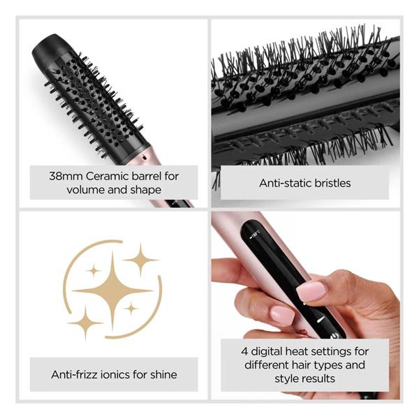 The 38mm ceramic-coated thermal barrel ensures big, bouncy results, giving lifeless locks an invigorating lift and volume. Experience a stunning transformation with every stroke as the Hot Brush revives flat hair and adds that coveted fullness. Its advanced ionic system, combined with anti-static bristles, effectively smooths frizz and controls flyaways, leaving your hair looking polished and radiant.