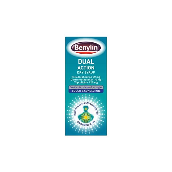 Benylin Dual Action Dry Syrup combines efficacy and ease of use. Make it your go-to solution for soothing dry coughs and unblocking nasal passages, allowing you to breathe and feel better in no time.