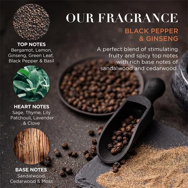 A distinctively modern collection for the sophisticated individual who appreciates the rich, luxurious and timeless fragrances of Black Pepper & Ginseng.