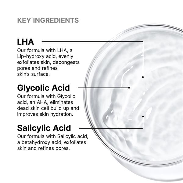 • Formulated with a combination of exfoliating agents: LHA, Glycolic and