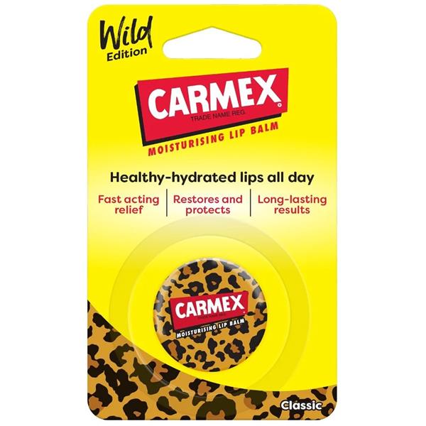 Carmex Moisturising Lip Balm Pot Blister Wild  (7.5g) is a moisturising lip balm, a hero product which delivers long-lasting relief to dry, chapped lips in wild print livery.
