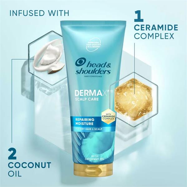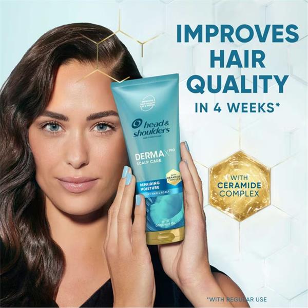 Get nourished and flake-free* hair with Head & Shoulders DermaXPro Repairing Moisture Anti Dandruff Conditioner. With each use, our conditioner helps to strengthen hair fibres against breakage, leaving your lengths nourished and with a lightweight feel. When massaged from roots to tips, with regular use, this conditioner improves hair quality in 4 weeks. It’s infused with coconut oil and ceramide complex (Piroctone Olamine + ceramide), and it is designed especially for dry scalps. Use together with our Head & Shoulders DermaXPro Repairing Moisture Anti-Dandruff Shampoo to help maintain dandruff protection, prevent dryness and flakes, and unlock beautiful, flake-free* hair from root to tip. (*Visible flakes, with regular use).