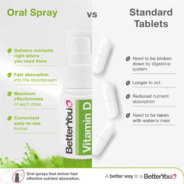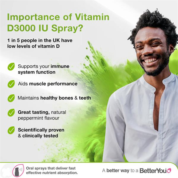 BetterYou D3000 Vitamin D Oral Spray is an optimum strength vitamin D supplements, specially formulated to deliver vitamin D through the soft tissue of the mouth for optimal absorption.