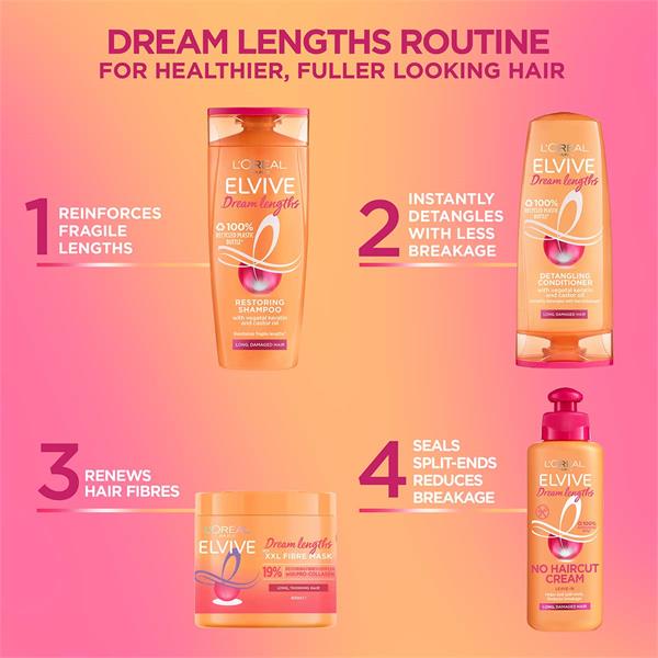 What makes it effective? Achieving the long hair of your dreams requires healthy, strong hair that resists breakage. Elvive Dream Lengths Shampoo combines [Vegetal Keratin and Castor Oil] to fortify and nourish the hair fibre from root to tip. This potent combination in our formula promotes hair strength, resilience, and a healthy shine.