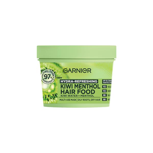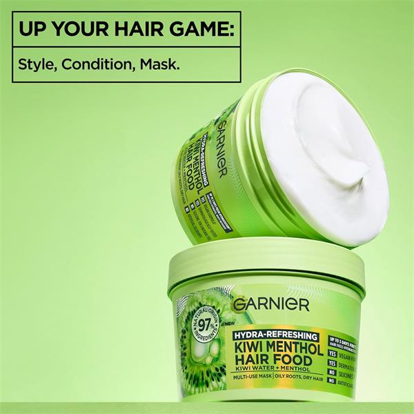 Give your hair a wake-up call! This multi-use hair treatment leaves hair feeling hydrated for up to 3 days*. Feel Fresh. Look Fresh, with New Garnier Hair Food Kiwi Menthol.