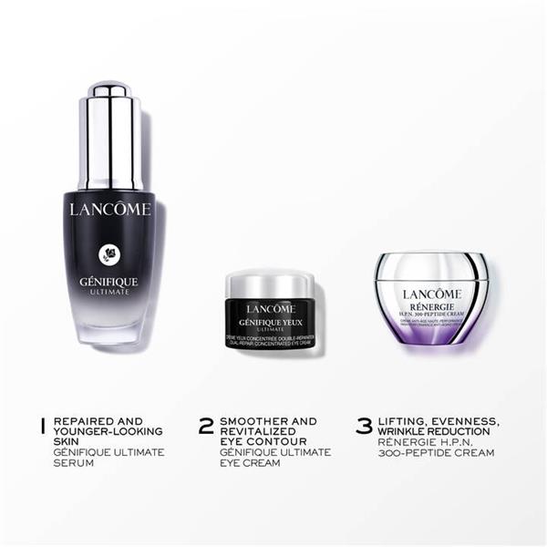 Introducing Lancôme’s Génifique Ultimate Discovery Set featuring our revolution in repair science with Génifique Ultimate Serum, paired with our Génifique Eye Cream targeting signs of fatigue, and Rénergie HPN 300 Cream, leaving skin looking younger after 8 weeks*.