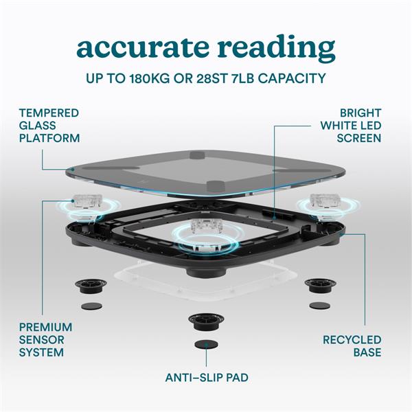 Built with style and user comfort in mind, glo™ features rounded edges that add a clean, minimalist look to your scale. Standing by our commitment to care for the planet, glo™ is crafted with recyclable and recycled materials - even down to the packaging.
