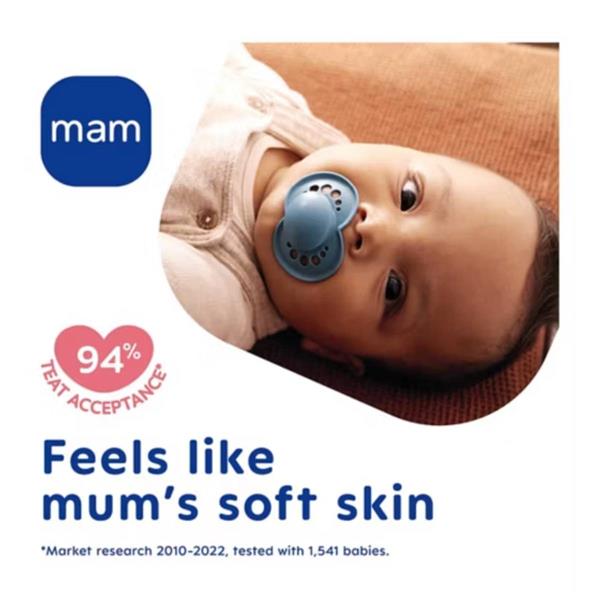 The MAM Original Pure soother has all the same great features as the MAM Original soother - including the SkinSoft™ Silicone teat which is easily accepted by 94%* of babies, and the flat, symmetrical shape designed in association with dentists to support healthy dental development. Packed in a handy self-sterilising box, these soothers can be sterilised in just 3 minutes in the microwave, and using this sterilising method can reduce CO₂ emissions by 77%**