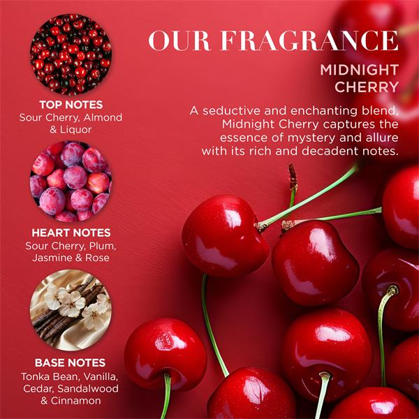 Indulge in a decadent symphony of senses. Our limited edition midnight cherry opulent fragrance opens with a tantalizing burst of tart, sour cherry, followed by a sophisticated liquor and rich, creamy almond accord.