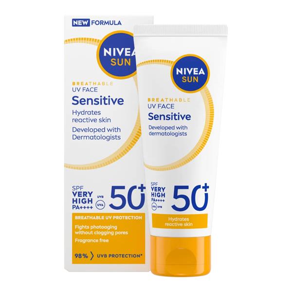 NIVEA SUN Breathable UV Face Sensitive SPF 50+ fights photoaging without clogging pores. Hydrates reactive skin and is fragrance-free.