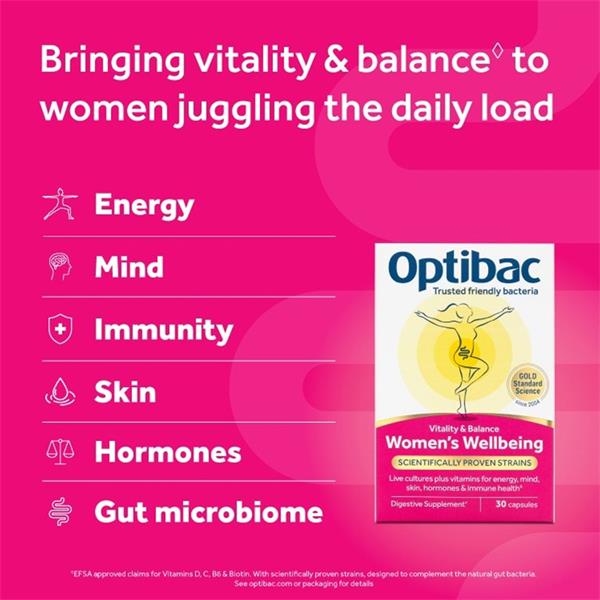 Discover the power of Optibac Women's Wellbeing, a premium all-round friendly bacteria supplement designed specifically for the stresses of daily life. Perfectly formulated to bring vitality & balance, this supplement enhances energy levels and reduces feelings of tiredness and fatigue.