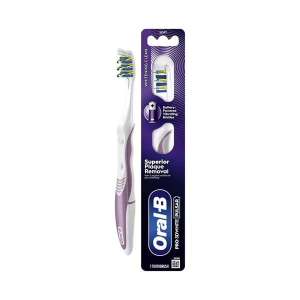 Experience a superior clean every day with the Oral-B Pro 3D White Pulsar Toothbrush. Its battery-powered vibrating bristles, MicroPulse technology and polishing pads work together to sweep away plaque and polish away stains — helping you achieve a fresher, brighter smile than a regular toothbrush. The brush’s PowerTip bristles reach right behind the back teeth and flexible sides adapt to each tooth’s shape, ensuring a thorough clean even in hard-to-reach areas. Compact, easy to use and gentle on gums, the Pulsar is ideal for anyone wanting an affordable but effective upgrade to their oral care routine.