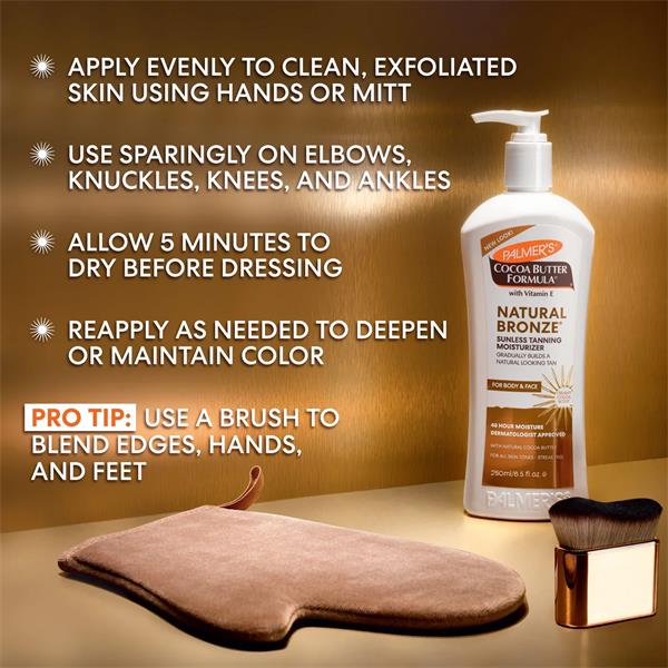 • For best results, apply Palmer's Natural Bronze evenly once daily or as often as necessary to achieve the desired level of colour.