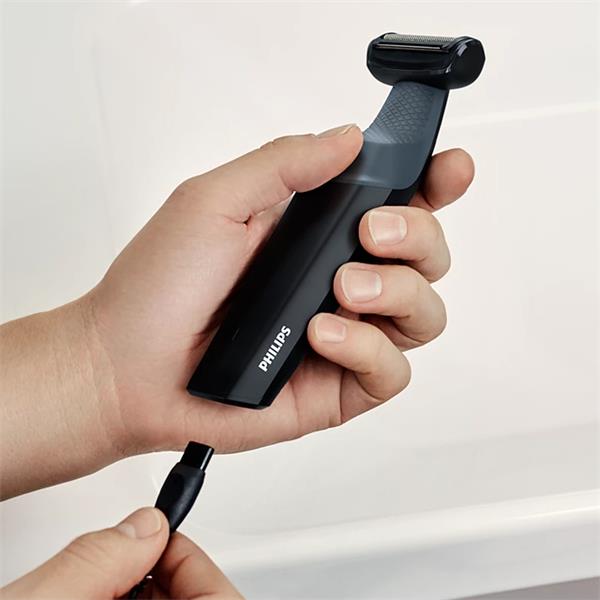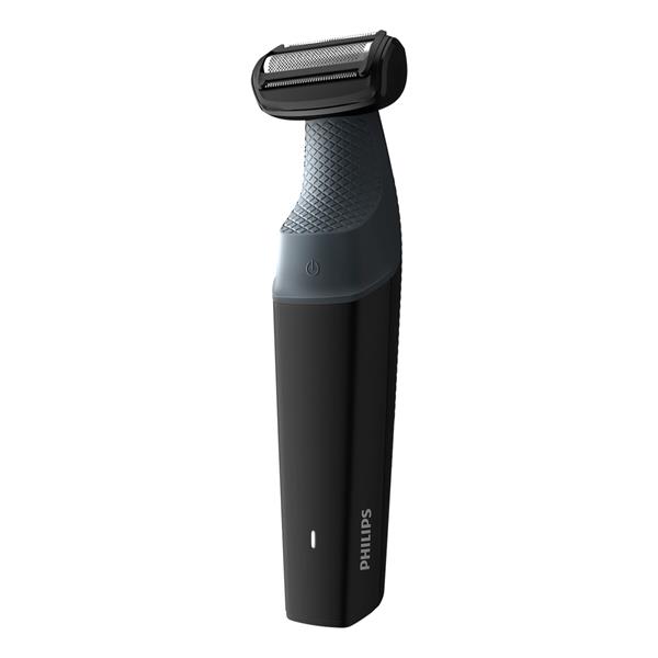 • The men's body groomer is designed to capture short, long and thick hair in a single stroke. The shaver head features patented rounded tips and a hypo-allergenic foil to protect your skin from cuts and nicks.