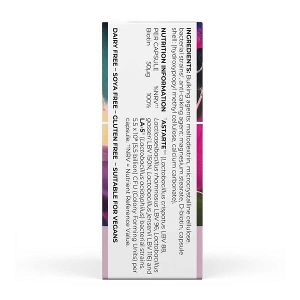 Bulking agents, maltodextrin, microcrystalline cellulose, bacterial strains (Astarte ™ and LA-5®), anti-caking agen: magnesium stearate, D-Biotin, capsule shell: (hydroxypropyl methylcellulose, calcium carbonate).
