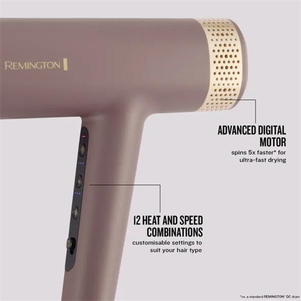 Get the frizz-free softness you’ll love with the REMINGTON® AIRvive™ Digital Hair Dryer. Its static-eliminating, high-speed Ionic Air Technology dries hair quickly without extreme damaging heat, whilst releasing heat-activated micro-conditioners onto your hair, for all-day frizz protection1. The advanced digital motor spins 5x faster2 to generate powerful airspeeds so that even the longest and thickest hair can be dried quickly. Plus, it's not just ultra-fast, it’s also ultra-gentle too. The protective thermal sensor regulates the air temperature to protect from extreme heat, whilst the Comfort+™ setting is gentle on the scalp and helps prevents uncomfortable heat build-up while drying. The magnetic slim styling concentrator and curl-defining diffuser rotate 360° for precise styling, and the 12 heat and speed combinations mean it's built for every hair type. The 15% smaller³ and 30% lighter³ T-shape design with optimised acoustics and extra-long power cord make it easy and comfortable to use.