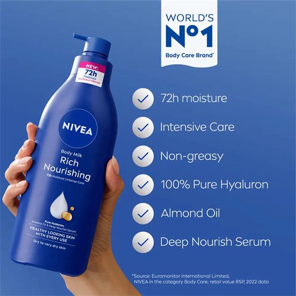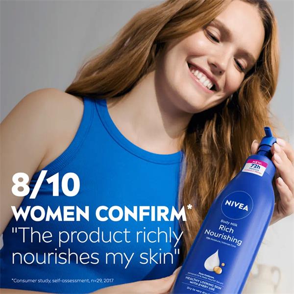 The NIVEA Rich Nourishing body lotion will noticeably reduce the roughness of your skin. Infused with the NIVEA DEEP MOISTURE SERUM, natural almond oil and vitamin E. The patented NIVEA formula uses the knowledge, that our skin contains sufficient moisture in its deeper layers.