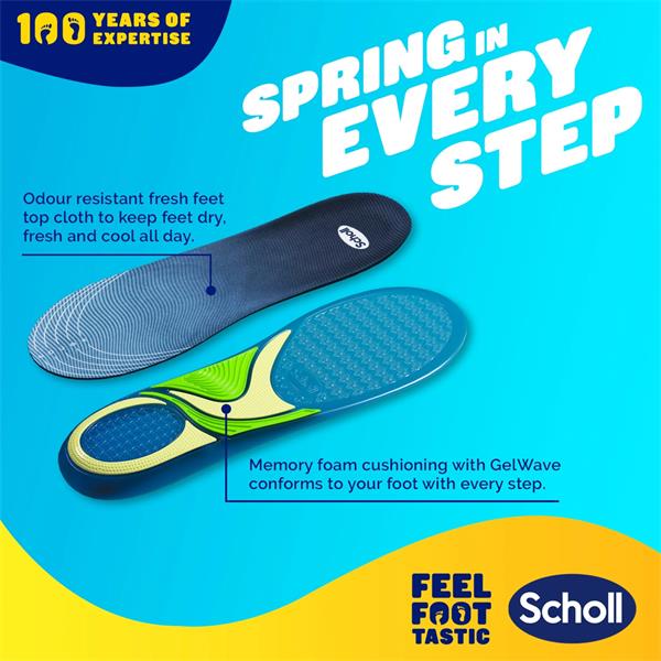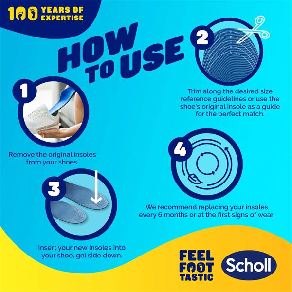 STAY ON YOUR FEET LONGER: The Scholl GelActiv Trainer Insoles have been designed to give all day comfort for active people. With added springiness, slip them into your sports shoes to help ease pressure on your feet all day long.