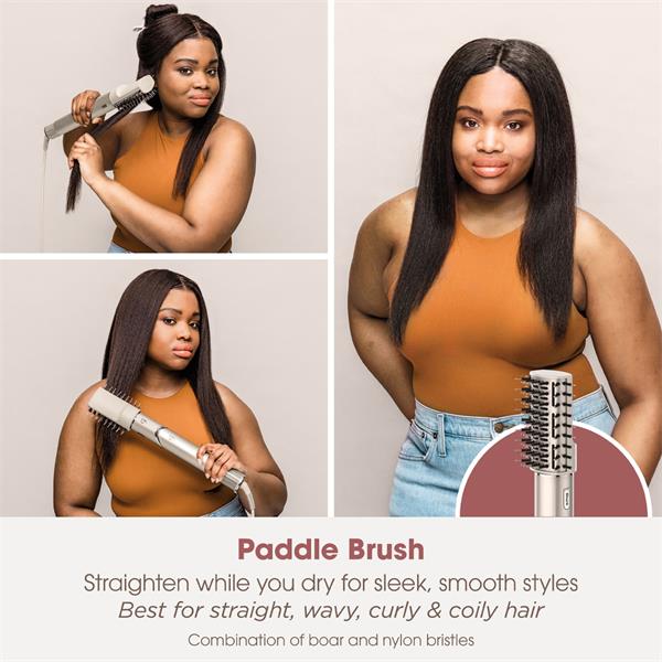 Straighten while you dry. Smoothing boar and nylon bristles add tension to straighten hair and enhance shine—ideal for sleek, straight styles.