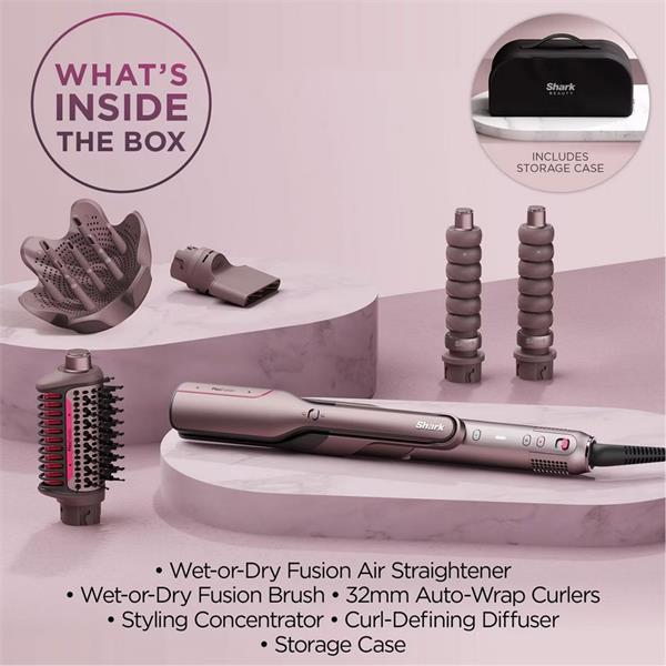 Shark FlexFusion Straight is the premium multi-styler system for hot tool styling with no heat damage*. FlexFusion Technology fuses heat-controlled ceramic and powerful airflow for styles that last.
