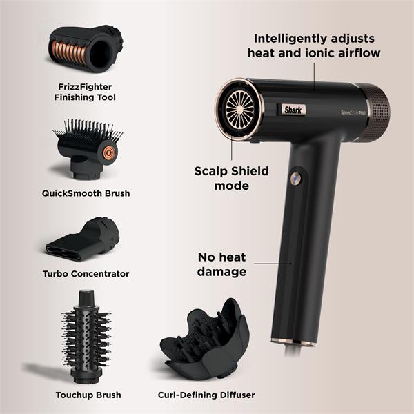 Introducing the Shark SpeedStyle Pro Hair Dryer System — your ultimate haircare revolution! Designed for powerhouse performance and zero heat damage, it's the only dryer you'll need for every hair type. Plus, with the Scalp Shield feature, it protects your precious new hair growth from harmful heat!