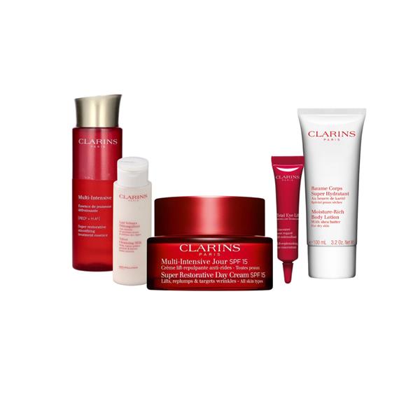 Restore your skin’s youthful glow with the Clarins Super Restorative Bundle. Formulated with powerful plant-based ingredients, this luxurious skincare set helps visibly firm, smooth, and nourish mature skin while reducing the appearance of fine lines and wrinkles. Skin feels deeply hydrated, revitalised, and beautifully radiant. Give your complexion the restorative care it deserves with this indulgent bundle.