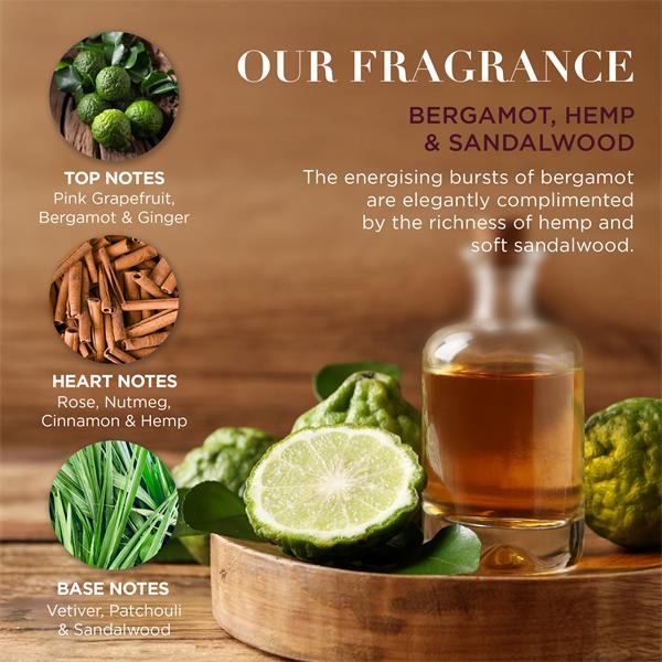 Apothecary blends of bergamot, hemp and sandalwood, infused with enriched essential oils of lemongrass and patchouli, bring this sophisticated fragrance combination to life.