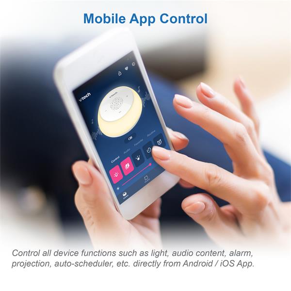 - Control everything from the subscription free app - Adjust night light ; Select story, song, sound ; Personal recordings ; Stream music;Projection control ; Set alarm / nap timer