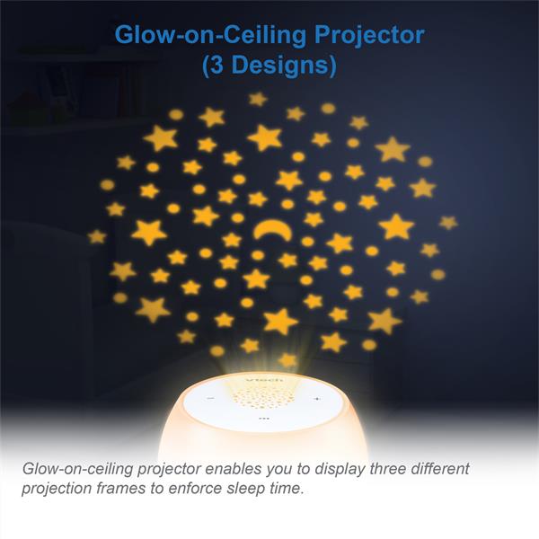 Glow-on-ceiling Projector - Showcase projections on top of the ceiling to help maintain child's focus while trying to sleep. You can choose from three different projection frames to help child associate with sleep time.